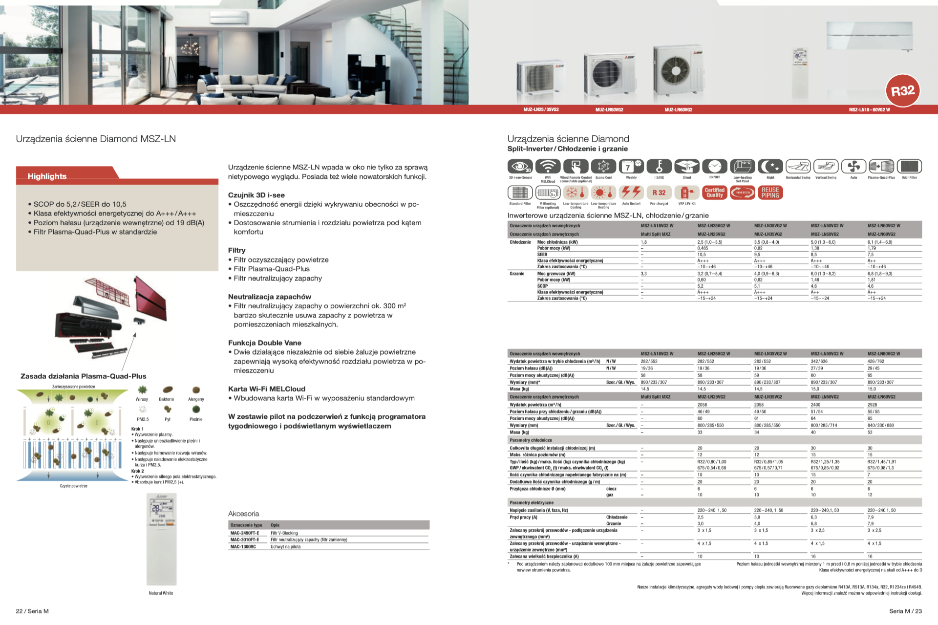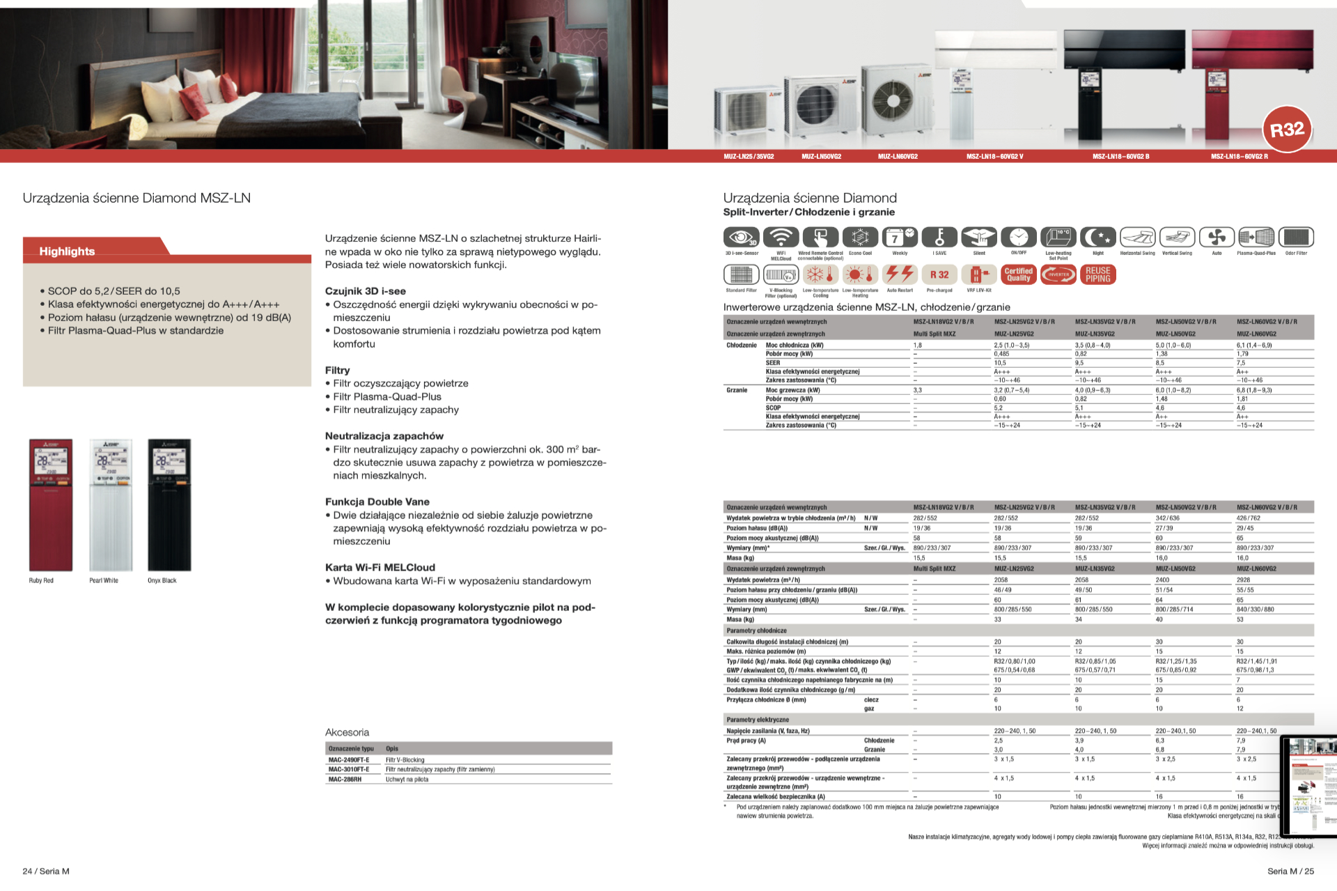 Klimatyzator ścienny Mitsubishi Electric MSZ-LN z serii Diamond łączy elegancki design z zaawansowaną technologią. Dostępny w czterech kolorach: Ruby Red, Natural White, Pearl White i Onyx Black, umożliwia dopasowanie do różnych aranżacji wnętrz. Urządzenie wyposażono w podwójne, niezależnie sterowane żaluzje powietrzne, które kierują strumień powietrza w różnych kierunkach, zapewniając równomierne chłodzenie lub ogrzewanie pomieszczenia. Zaawansowany filtr Plasma-Quad-Plus skutecznie usuwa z powietrza pyłki, wirusy, pleśń, bakterie i alergeny, dbając o czystość powietrza. Czujnik 3D i-see wykrywa obecność i położenie osób w pomieszczeniu, dostosowując pracę klimatyzatora dla optymalnego komfortu i efektywności energetycznej. Dodatkowo, dzięki aplikacji MELCloud, użytkownik ma możliwość zdalnego sterowania urządzeniem za pomocą smartfona, tabletu lub komputera.