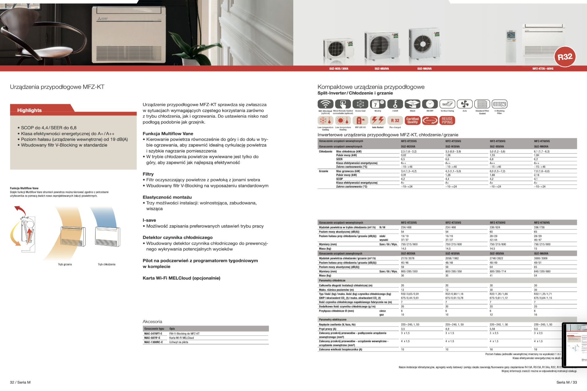 MFZ-KT pracuje wyjątkowo cicho – od 20 dB(A), a dzięki wbudowanemu detektorowi czynnika chłodniczego zwiększa bezpieczeństwo użytkowania. Funkcja I-Save pozwala na zapisanie preferowanych ustawień pracy, a elastyczne opcje montażu (wolnostojąca, zabudowana, wisząca) sprawiają, że urządzenie można dostosować do różnych wnętrz.