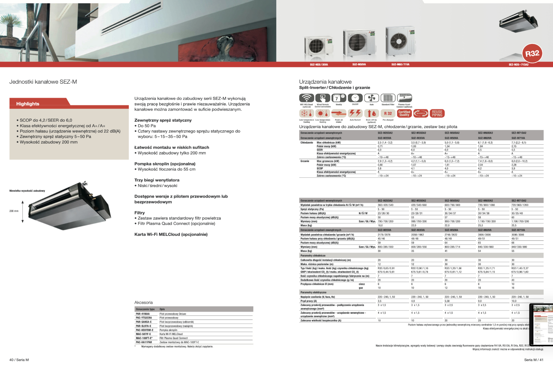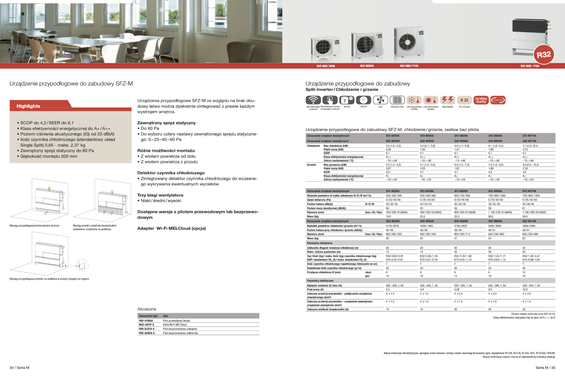 Urządzenie osiąga klasę energetyczną A++ w trybie chłodzenia i A+ w trybie grzania, oferując wysoki współczynnik SEER do 6,1 i SCOP do 4,2. SFZ-M wyposażono w trzy biegi wentylatora, umożliwiające regulację intensywności nawiewu, oraz detektor czynnika chłodniczego dla zwiększonego bezpieczeństwa.