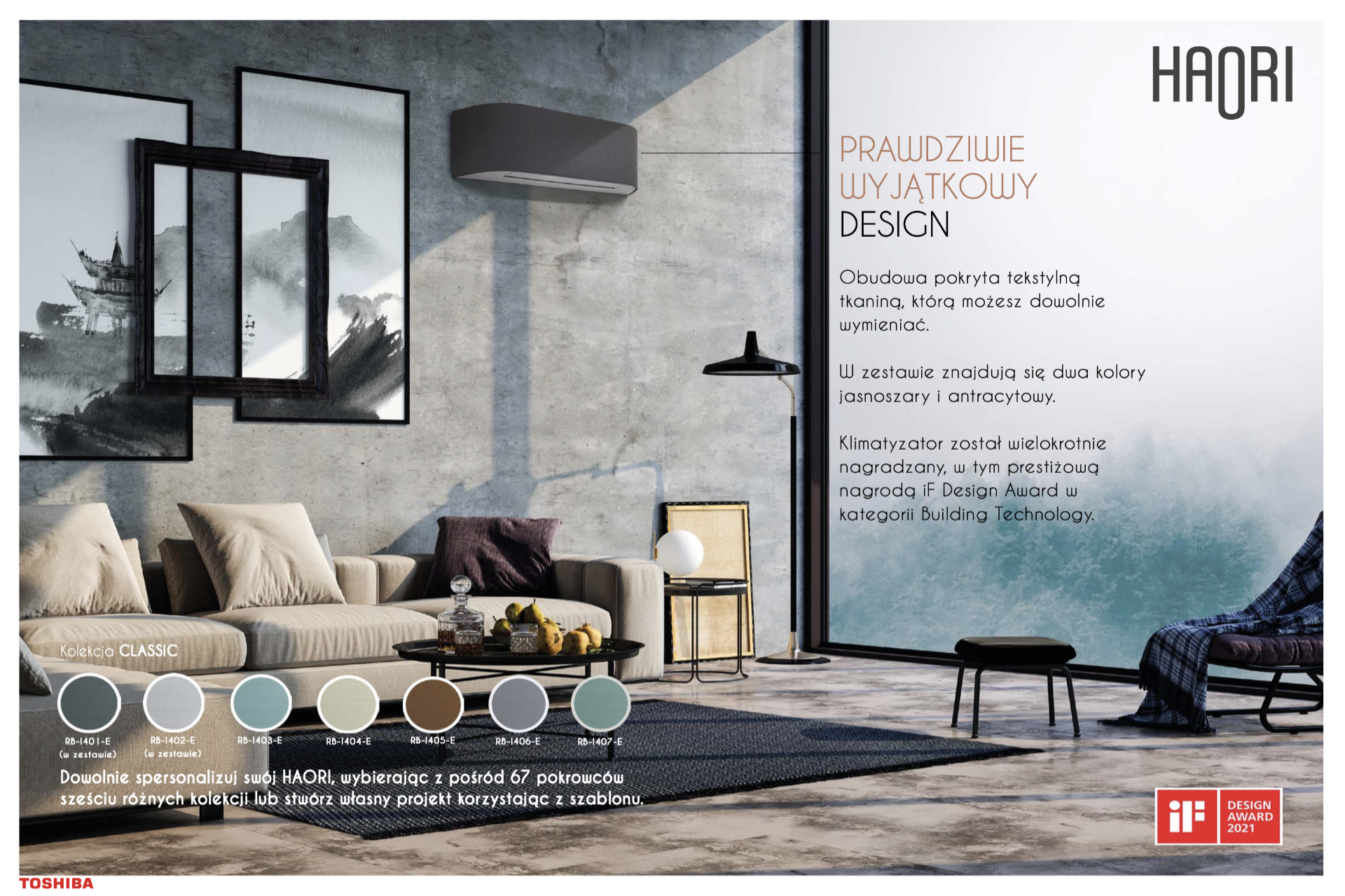 Haori wyróżnia się unikalnym, tekstylnym panelem przednim, który można łatwo dostosować do wystroju wnętrza dzięki wymiennym tkaninom. Ten klimatyzator oferuje wysoką efektywność energetyczną oraz wbudowany moduł Wi-Fi, umożliwiający zdalne sterowanie. Nowoczesny design i cicha praca czynią go doskonałym wyborem dla osób ceniących estetykę i komfort.