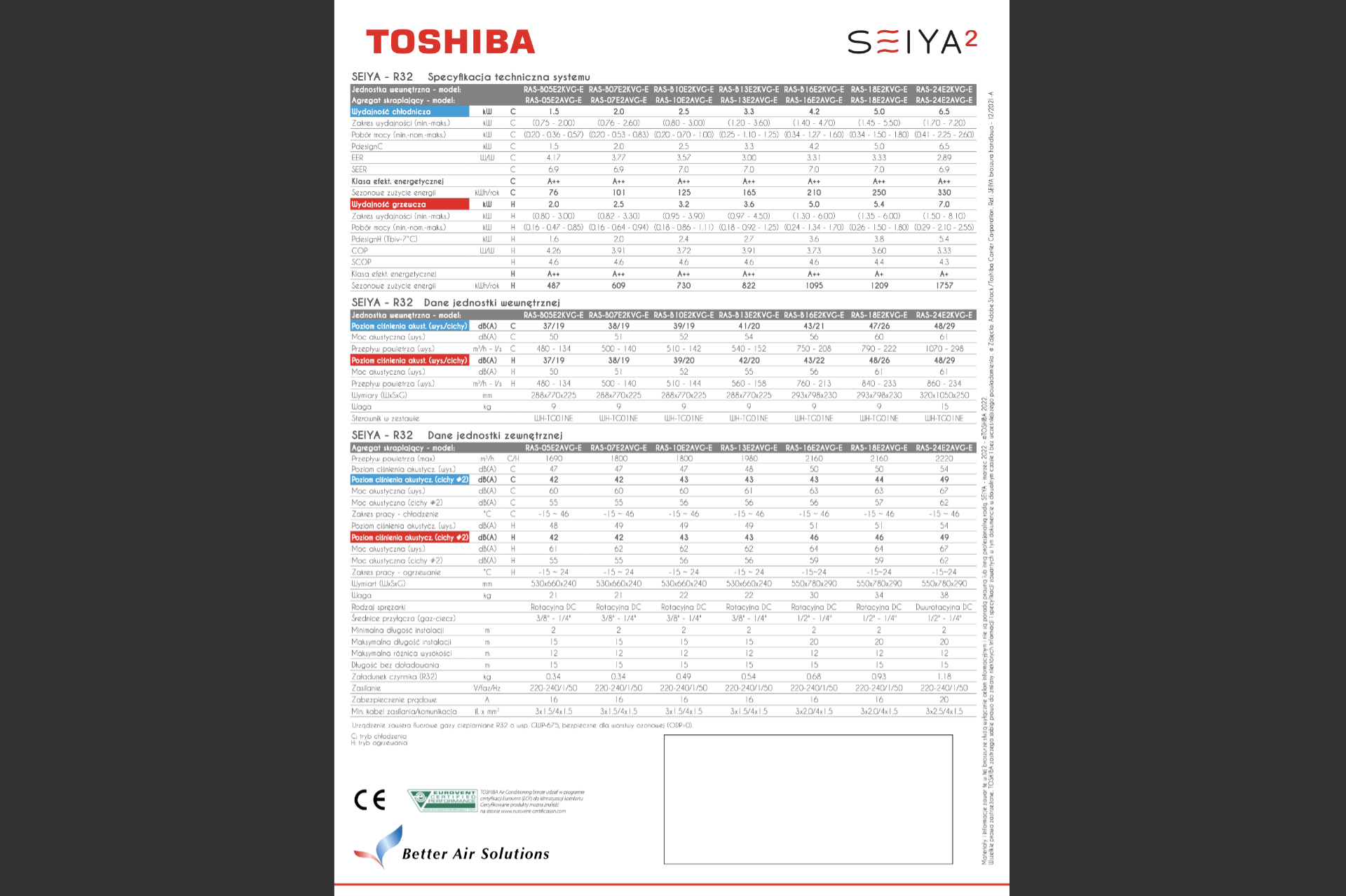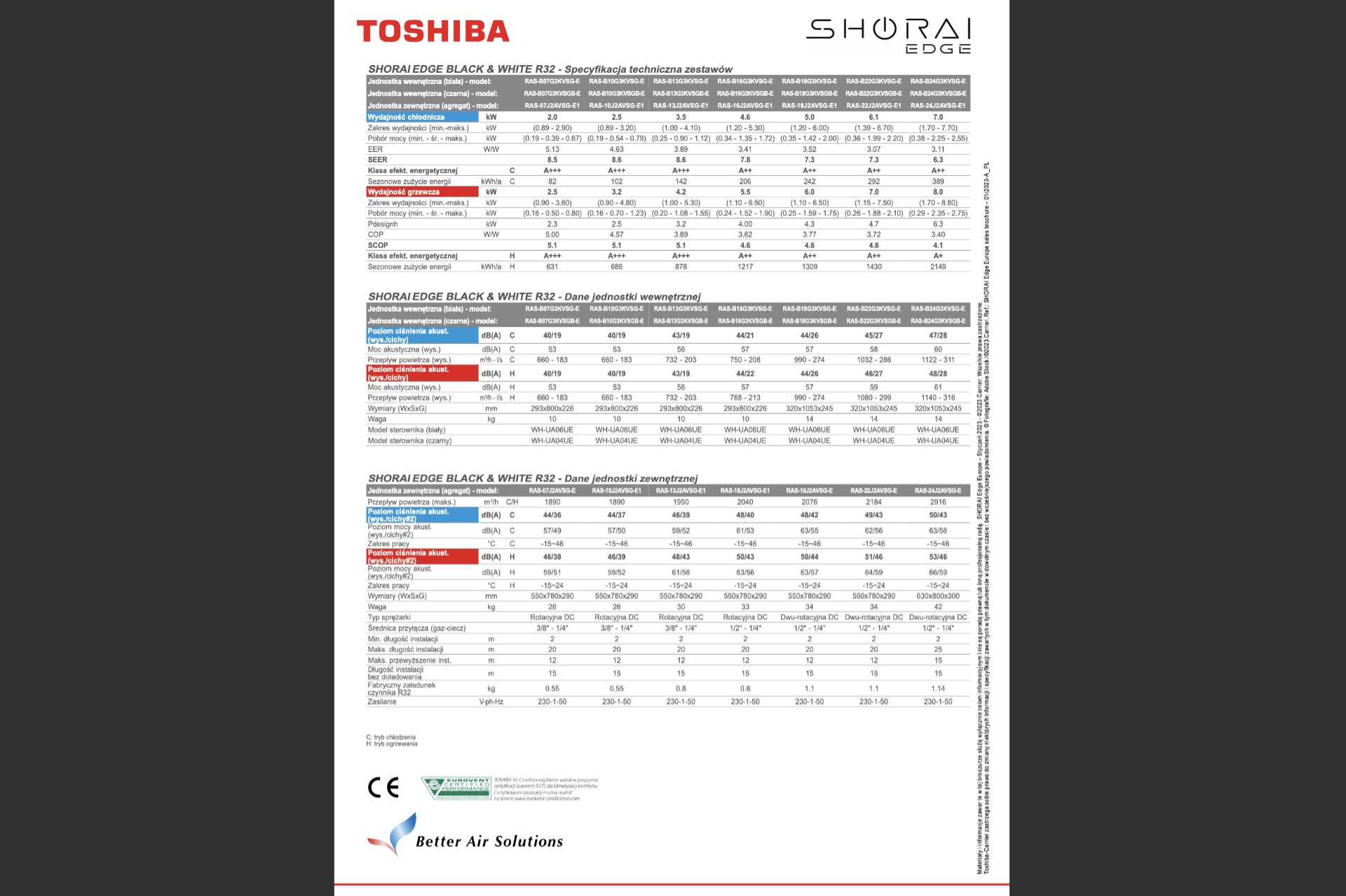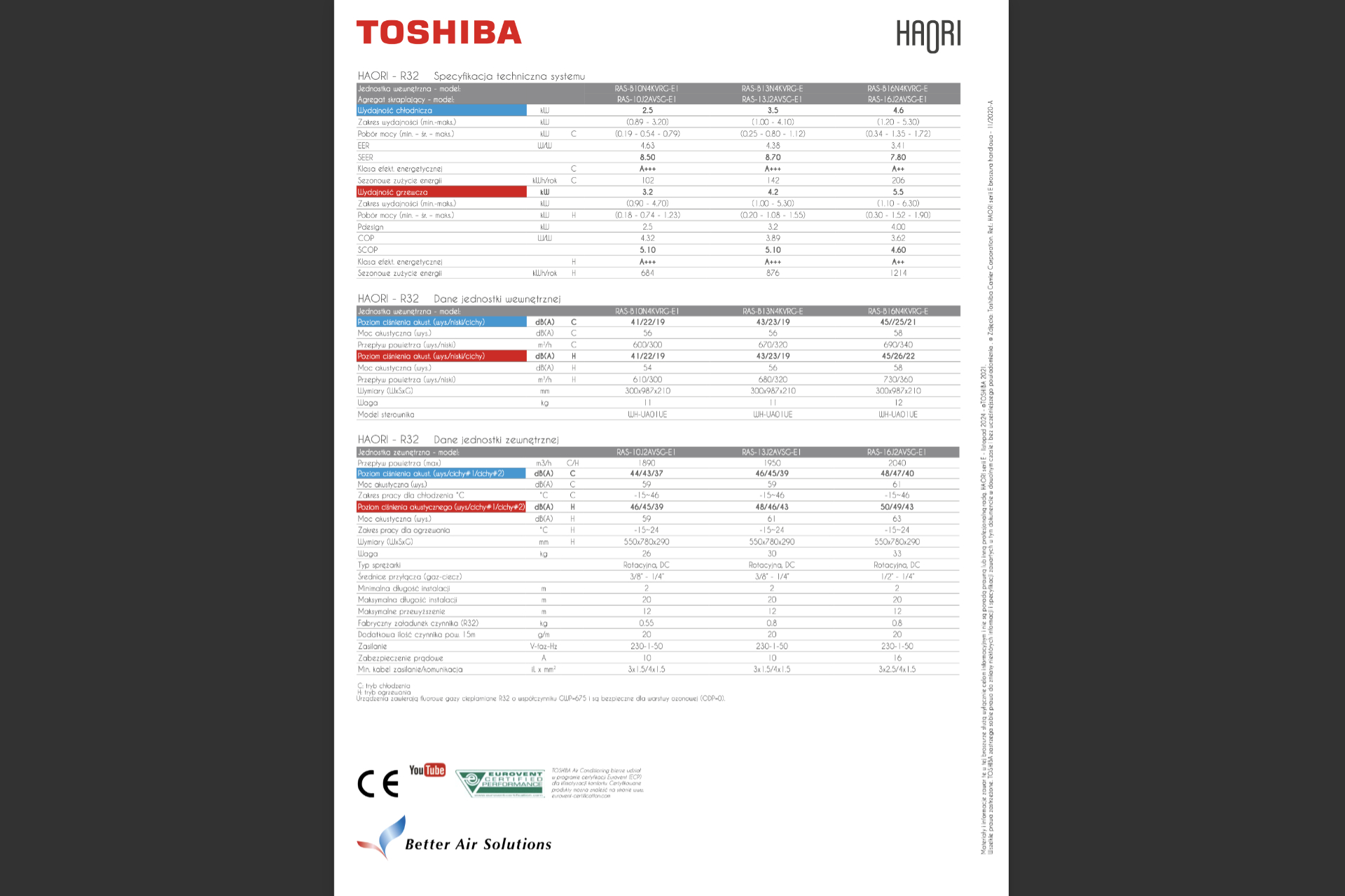 Toshiba to globalny lider w dziedzinie klimatyzacji, oferujący innowacyjne, energooszczędne i ekologiczne rozwiązania. Klimatyzatory marki Toshiba wyróżniają się cichą pracą, zaawansowanymi systemami oczyszczania powietrza oraz inteligentnym sterowaniem. Nowoczesny design i niezawodność sprawiają, że produkty Toshiba zapewniają komfort i doskonałą jakość powietrza zarówno w domach, jak i przestrzeniach komercyjnych.